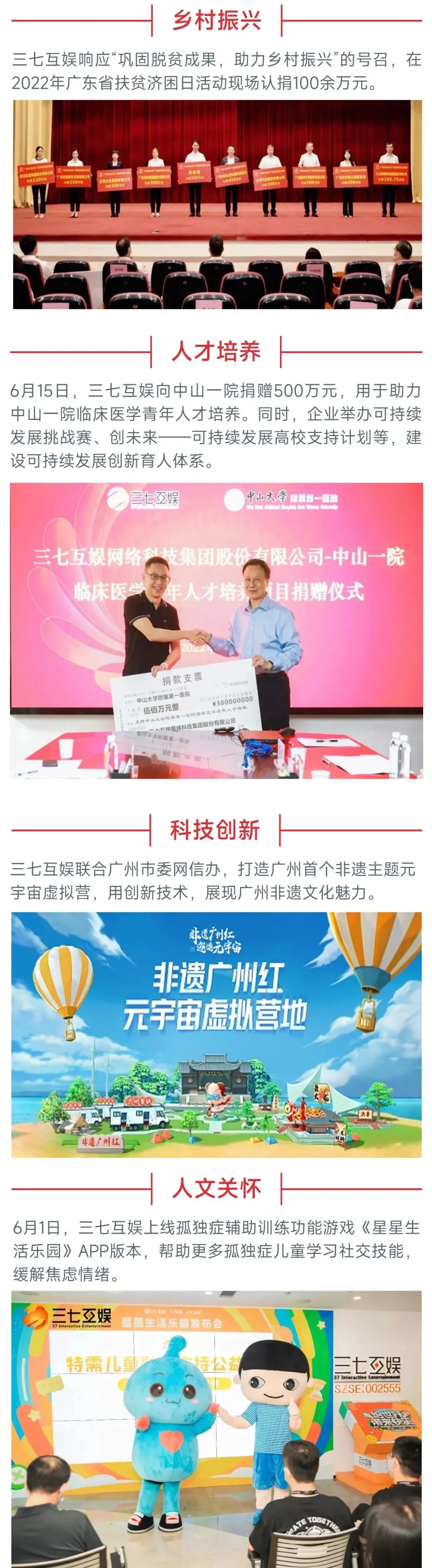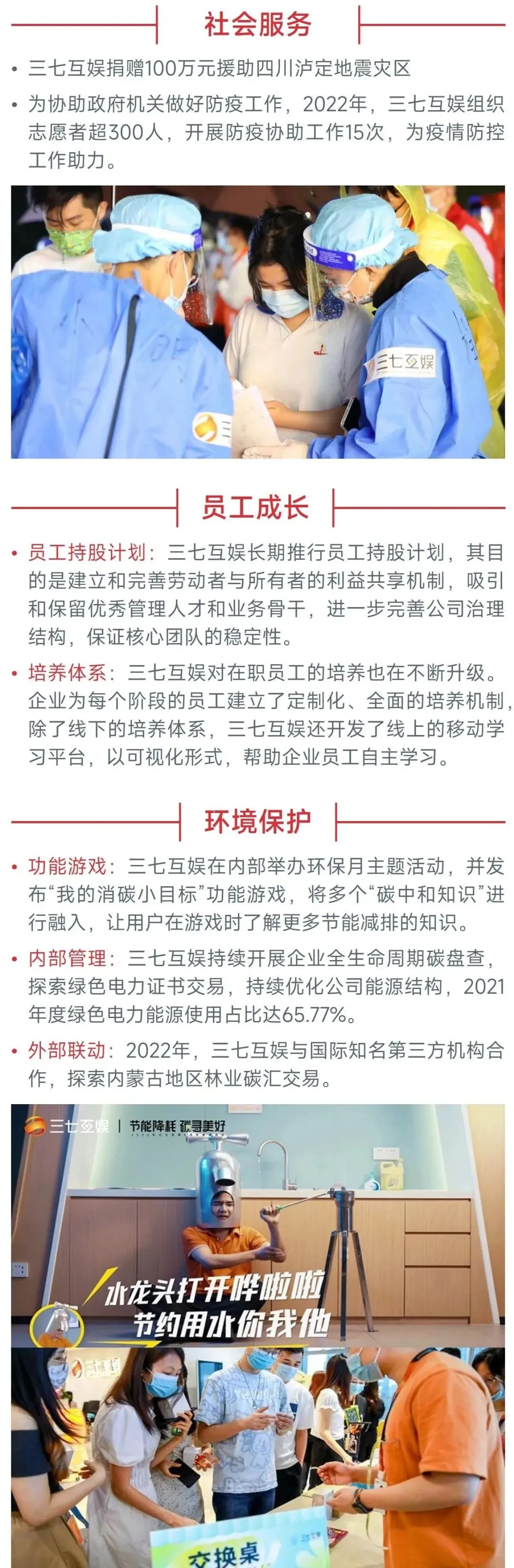 在社会责任领域三七互娱长期投入,并重视可持续发展,2022年在社会支持、环境保护、公司治理等ESG理念的细分层面取得更为成熟的社会责任成果。在社会支持层面,三七互娱通过公益事业布局乡村振兴、人才培养、科技创新等领域,对于社会自然安全以及特殊人群也较为关注,同时着手网络安全项目,以宣传、功能游戏等方式为产业提供布局参考;在环境保护层面,三七互娱响应国家“双碳”目标战略部署,企业内外多举措践行“环保、低碳、绿色、文明”观念;在公司治理层面,赋能外部人才的同时,在企业内部三七互娱持续迭代员工激励机制、优化培训体系等,帮助员工建立更为清晰的职业发展规划。