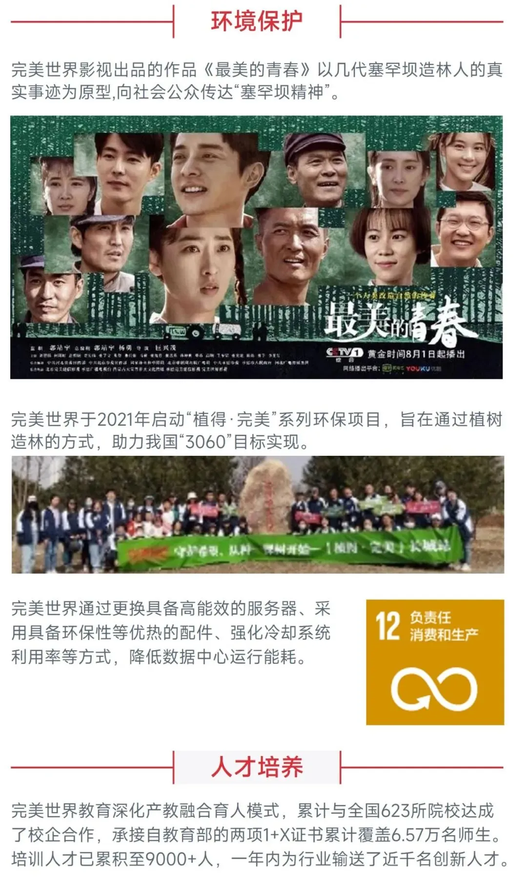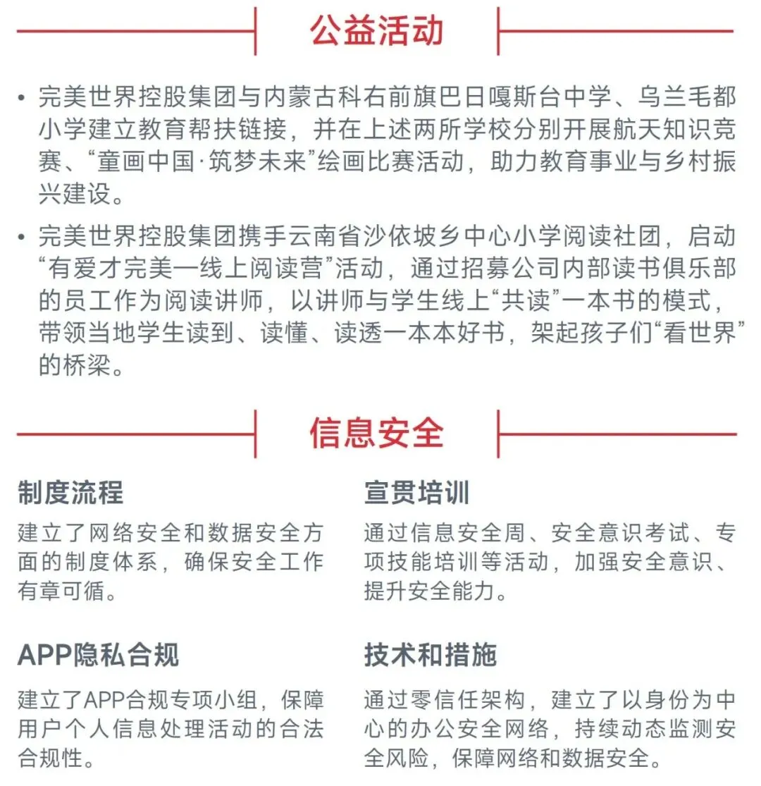 完美世界在数实融合、环境保护等方面持续履行社会责任,同时得益于多元的业务体系,完美世界围绕垂直领域的履责成果通常更为全面。在数实融合层面,近年来基于数字技术提升文化产业发展效果受到国家层面的重视,完美世界也依托于自身的技术积累和文化产品研运经验持续布局这一领域,将现实文化与数字内容有机结合,在游戏、文旅、数字人等细分领域均产出了代表性成果,有效推动了数实融合的实质性发展;环境保护方面,完美世界注重绿色可持续发展,通过影视、环保项目等方式调整自身工作布署,并向公众传播绿色发展理念;人才培养方面,完美世界教育深化产教融合育人模式,现阶段校企合作的院校数量已达数百所,一年内为产业输送近千名创新人才;此外,完美世界在公益活动、信息安全等领域也取得进展。