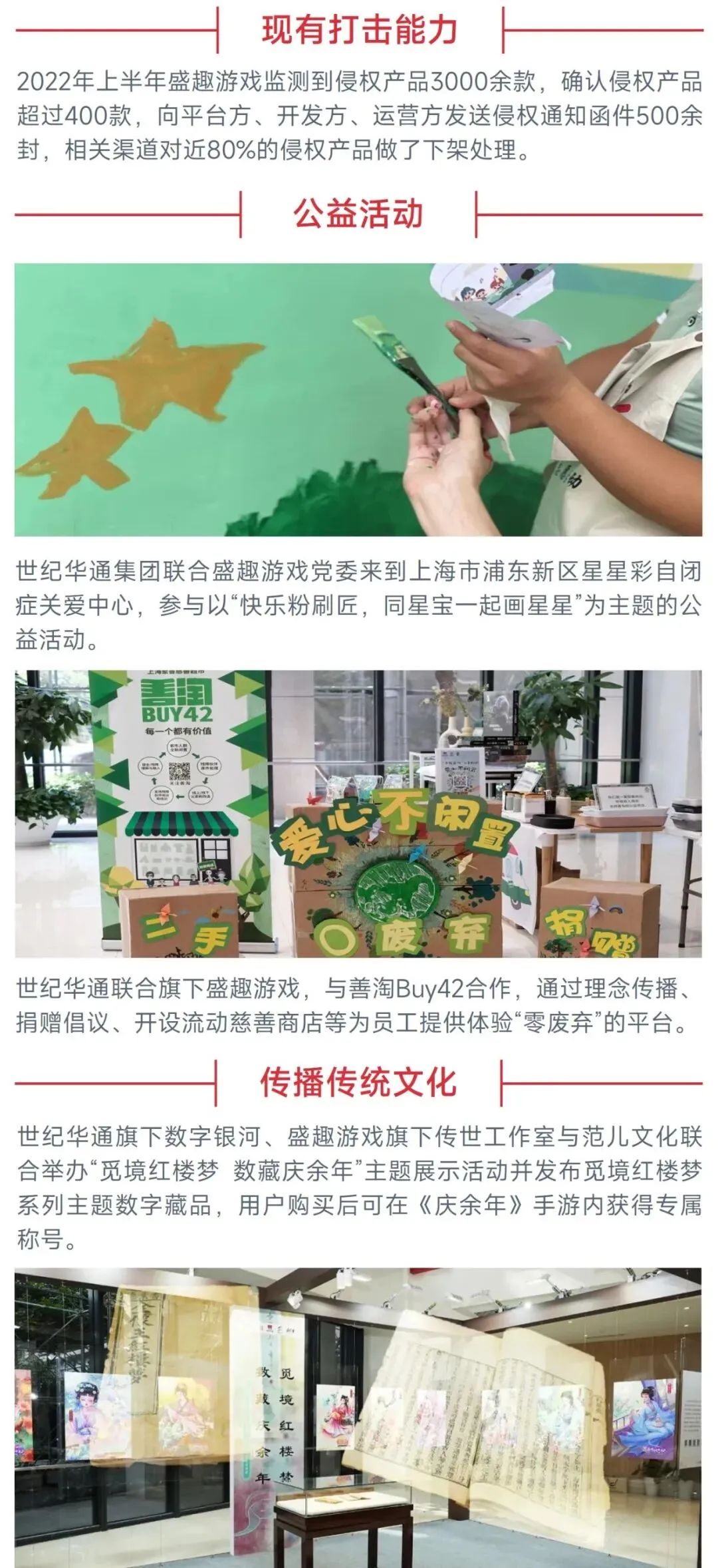 世纪华通在技术赋能、知识产权保护、完善企业治理等方面履行社会责任。技术赋能方面,企业履责成果较为直接地服务于社会公众,例如《数眠》有助于提升公众的睡眠质量,脑机研究也取得进展,两次入刊全球顶级科学杂志;知识产权保护方面,旗下IP“传奇”的价值、被侵权状况在国内均为典型代表,并带动企业高度关注知识产权保护,本年度企业在学术、产业示范层面继续推进;完善企业治理方面,世纪华通的社会责任布局更为系统化,CSR委员会在本年度成立。此外,世纪华通在公益、传统文化等领域也有成果产出,这也是重点且持续投入的领域,公益方面世纪华通每年均投入资源参加或组织活动,并带动旗下员工参与;传统文化方向世纪华通《庆余年》《传奇世界》等多款产品本身便具备中国文化内涵,世纪华通进一步结合数字藏品等热点推广模式,提升游戏用户对于传统文化的关注度。