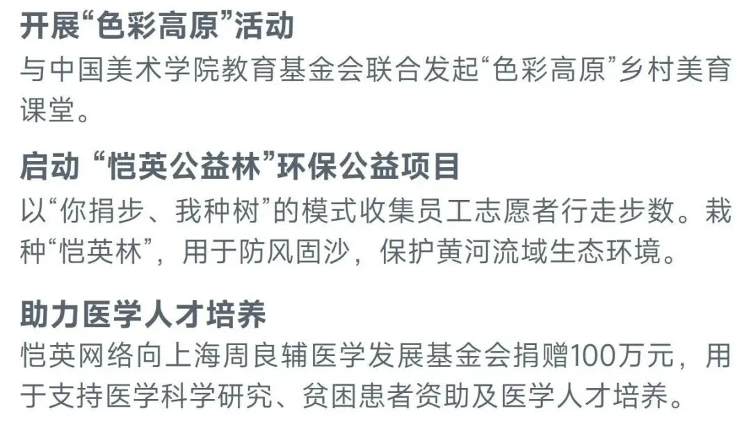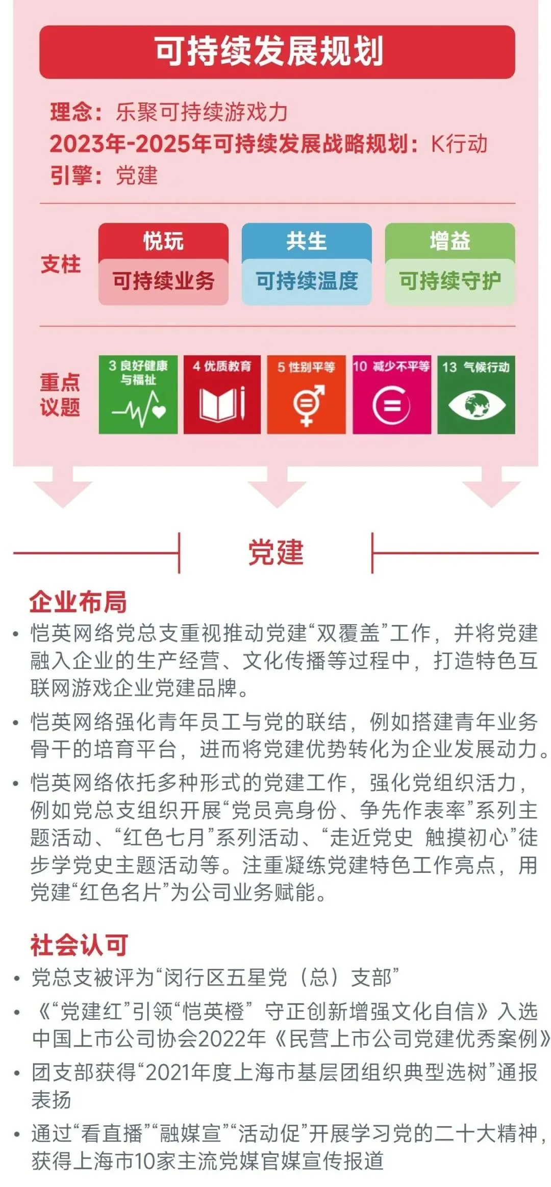 本年度,恺英网络的社会责任布局出现了较为明显的转型升级:一方面,企业将相对分散的履责事件梳理为更成体系的可持续发展规划,现阶段已发布可持续发展理念“乐聚可持续游戏力”,提出可持续发展行动“K行动”,并明确企业关注的重点议题,以及实现规划的支柱能力。另一方面,围绕上述规划,企业不断加码在细分领域的布局力度,党建方面,企业将党建作为履责引擎,组织开展“党员亮身份、争先作表率”“红色七月”“走近党史 触摸初心”等多项系列活动,现阶段已获得较多社会认可,例如恺英网络党总支被评为闵行区五星党总支、党建案例入选中上协2022年《民营上市公司党建优秀案例》;传播传统文化方面,企业依托文化产品深度还原中国文化并孵化原创IP,而在用户重视精品内容的文化产业发展趋势下,深度还原文化内容也有助于延长IP生命周期,进而成为企业依托IP履责的重要支点;公益方面,恺英网络布局较多,例如乡村教育、生态保护、灾难救助等,同时部分项目的布局时间较长,例如连续三年开展的 “云支教乡村小课堂”在线授课计划;“游戏+”方面,企业加码“游戏+医疗”,现有布局主要关注脑疾病患者的生命质量。