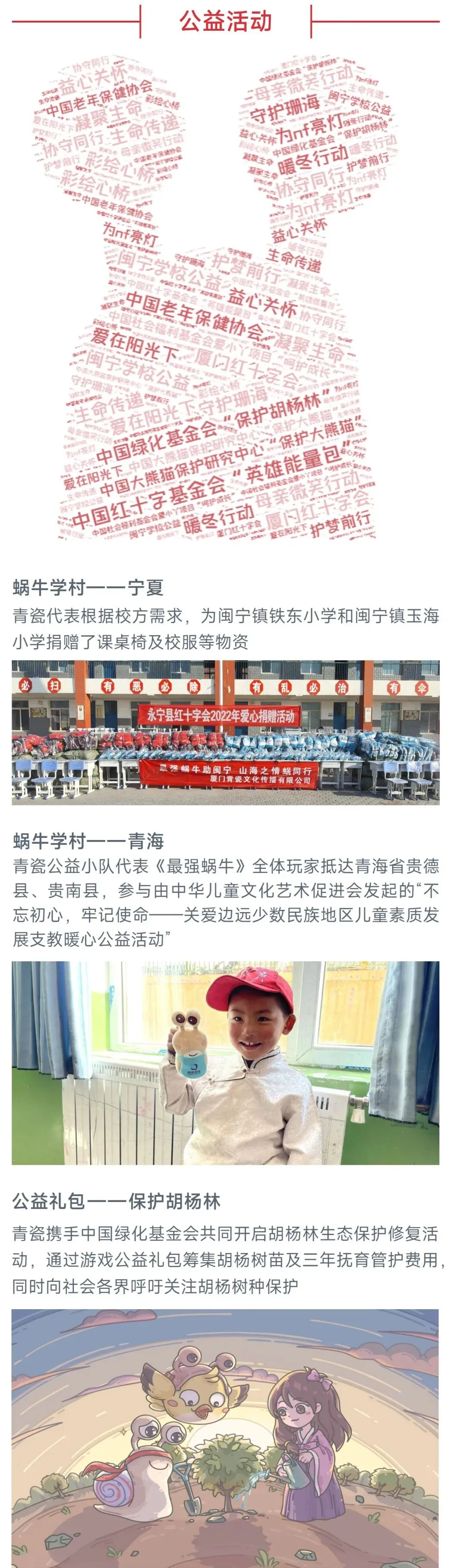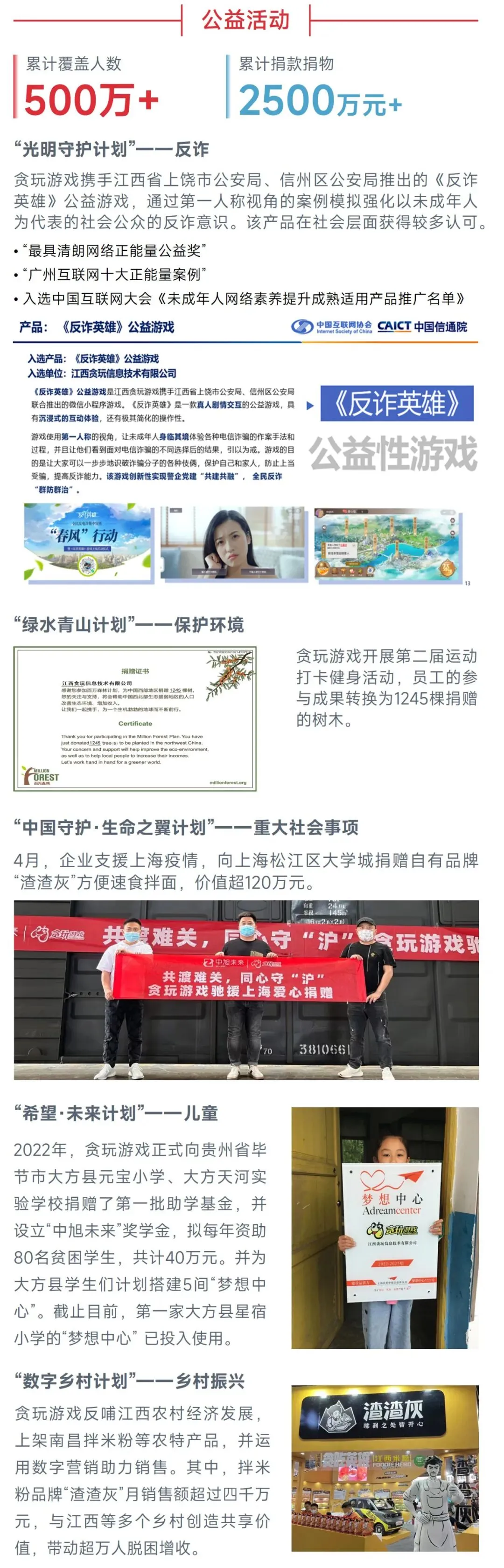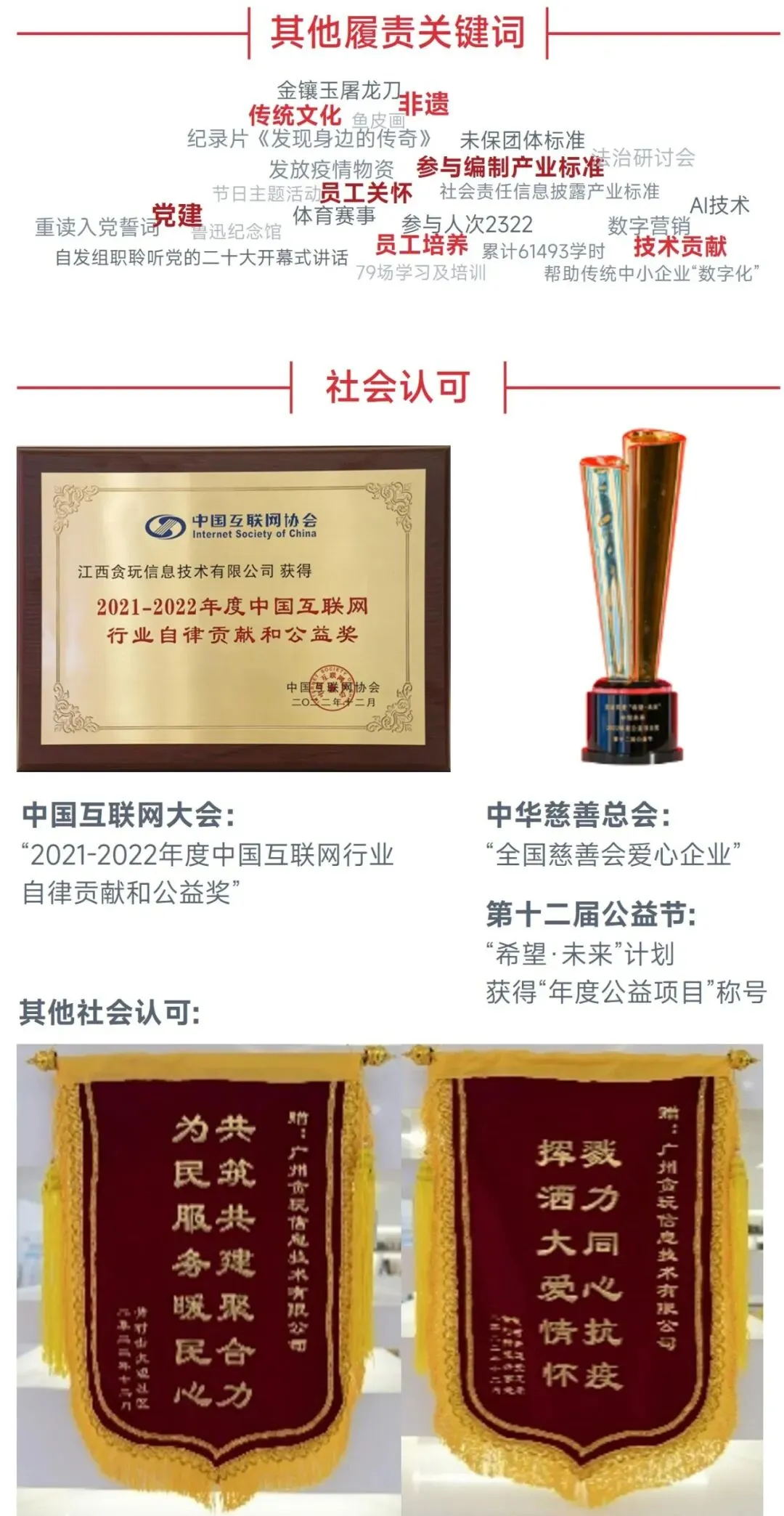 贪玩游戏从公益活动、传统文化传播等方面履行社会责任。其中,公益活动的履责成果最为突出,主要体现在两个方面,一方面,布局力度加码,本年度企业举办公益事件数量超30件,捐款捐物超800万元;另一方面,布局更成体系化,历史上已布局的助力儿童成长、支援贫困地区等领域,在本年度被梳理为更成体系的系列计划,企业的长期布局思路更为清晰。传播传统文化方面,本年度企业与非遗结合较密,并强化数字技术在其的运用。此外,员工关怀、党建等方面贪玩游戏的履责成果也较优,并获得多家社会机构认可。