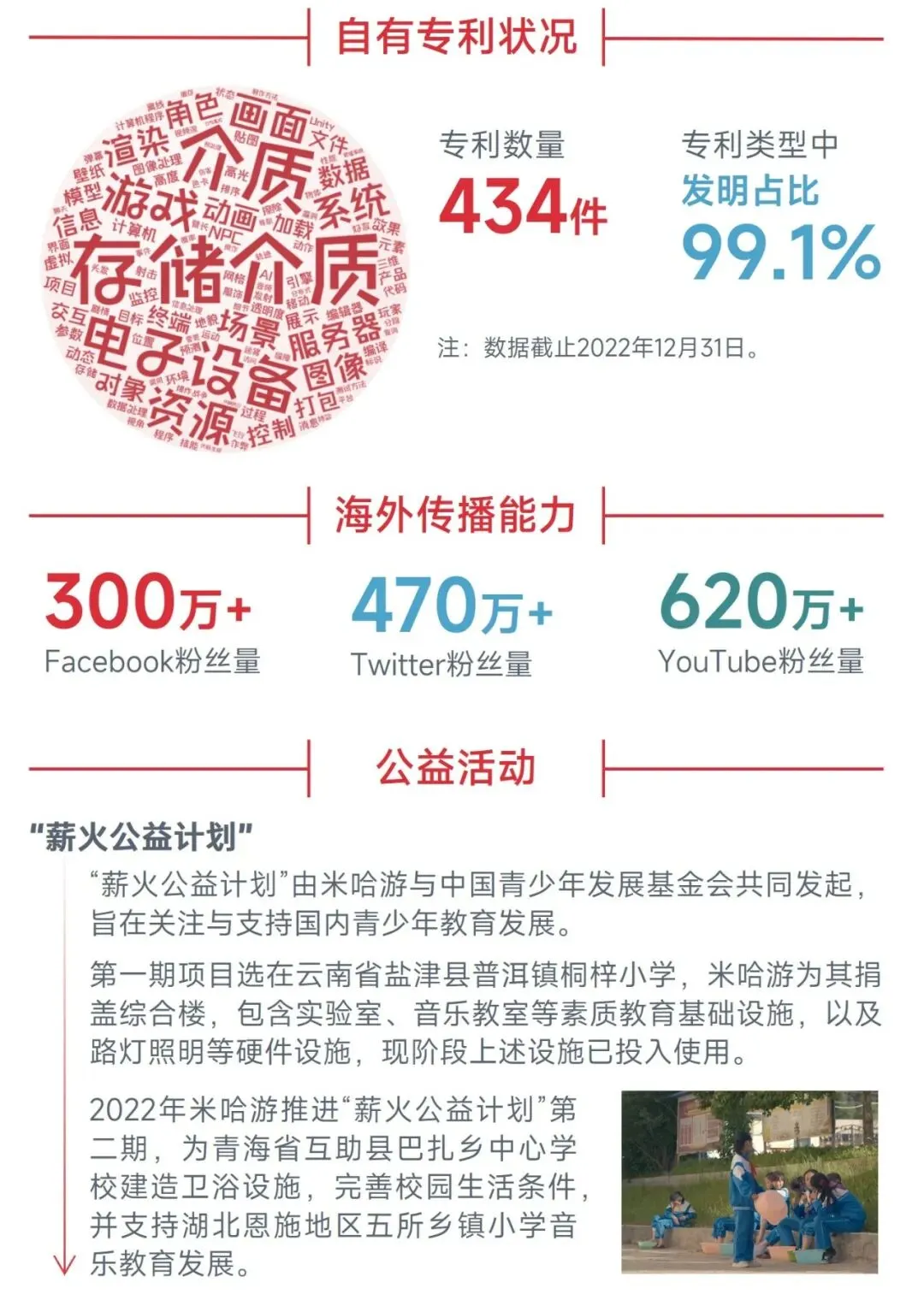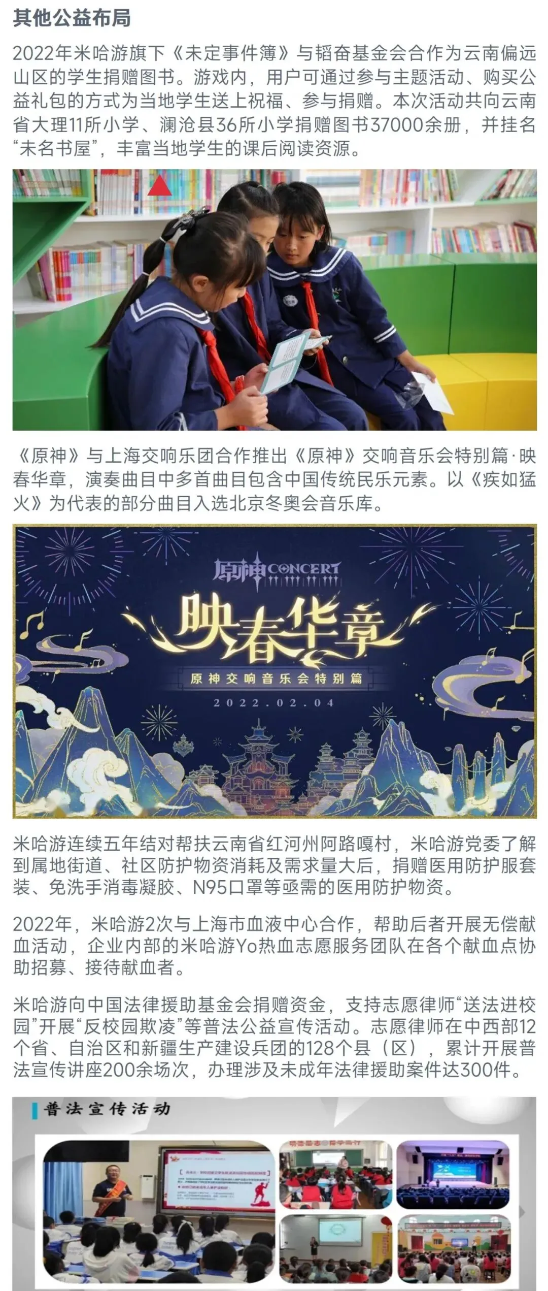 以技术创新为依托,米哈游实现了较为深入的社会责任布局,其背后是企业的长期技术投入,现阶段申请专利数量已超400件。凭借技术优势,米哈游旗下产品以高质量获取用户,例如依托于持续深耕的引擎技术,米哈游旗下产品能在移动端提供近似主机游戏的画面表现,并在移动端实现了开放世界这一创新玩法,进而全方位提升用户体验,对于中国游戏研发技术的提升起到了显著的推动作用。同时,米哈游也在持续探索单机/主机等高技术投入领域,未来有望进一步提升研发水准。在研发技术的支撑下,米哈游旗下产品也得以面向全球用户,进而更好传播中国文化内容。公益活动的成果产出也较多,本年度,米哈游一方面延续基于产品、系列计划的公益布局,例如开展《未定事件簿》的图书捐赠活动、基于《原神》音乐的传统文化传播活动、薪火公益计划第二期;另一方面强化对社会重要事件的关注力度,例如号召无偿献血、提供反校园欺凌法律服务。此外,米哈游在信息安全领域也持续推进。