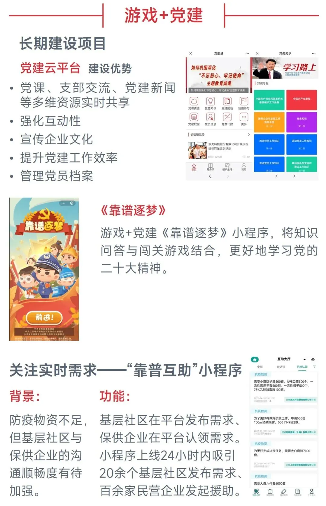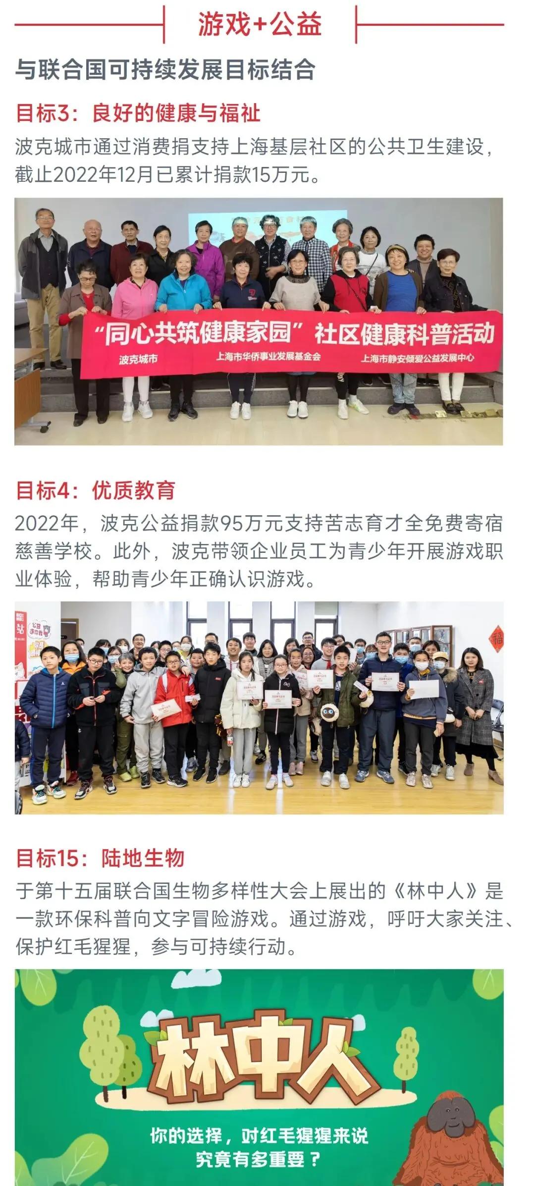 “游戏+”是波克城市履行社会责任的核心,围绕“游戏+”,企业在“游戏+公益”“游戏+党建”“游戏+医疗”等方面成果较为明显。“游戏+公益”方面,波克城市与联合国可持续发展目标结合较密,并以月度、年度报告等形式回顾;“游戏+党建”方面,波克城市设立专有办公室,既规划、推进长期党建项目,例如党建云平台、知识小程序,又关注实时需求,例如开发对接抗疫供需双方的互助平台;“游戏+医疗”方面,游戏化数字疗法产品《快乐视界星球·视觉训练系统》正式上线。此外,企业在“游戏+传统文化”、人才培养等领域也有成果产出,并继续拓展“游戏+”的结合领域与深度,这也有望带动企业挖掘更多社会价值,进而从更多维度践行社会责任。