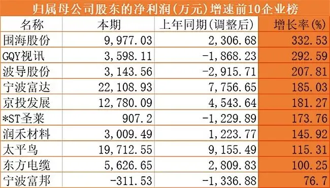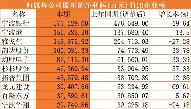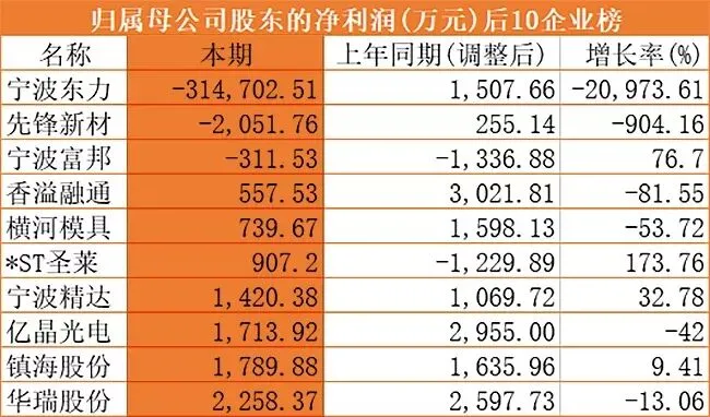 这是今年上半年宁波73家A股上市公司归母净利润最高、最低的各10家公司名单: