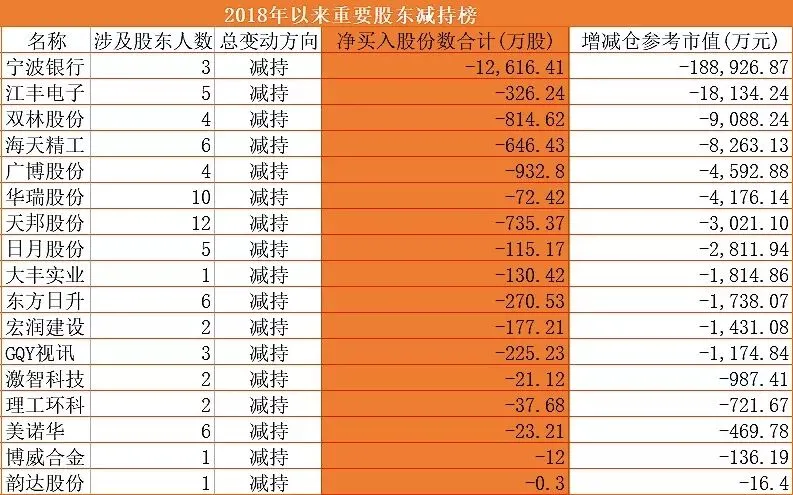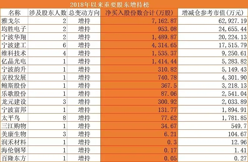 据Wind数据统计显示,在二级市场上,宁波辖区上市公司共有35家获重要股东增减持,其中18家公司获增持,17家公司遭减持。名单如下: