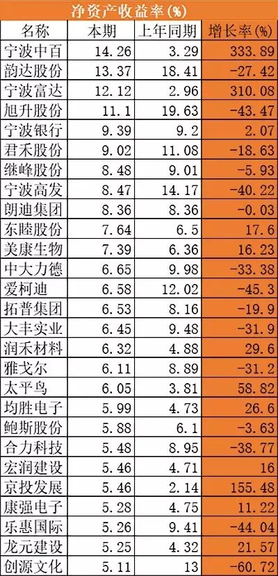 净资产收益率作为反映上市公司盈利能力及经营管理的核心指标,表现越好,意味着企业的赚钱效率越高。出人意料的是,宁波中百——即二百这个“老家伙”,在这项指标上拔得了头筹。下面是净资产收益率超过5%的公司名单:
