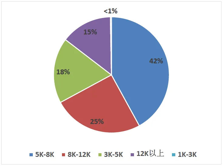 通过本次云聘大会数据统计分析,本年度物流企业提供薪资情况为:5K-8K最多,占比42%,平均薪资在9K左右,其中薪资最高的为营销、策划与海外拓展相关岗位。