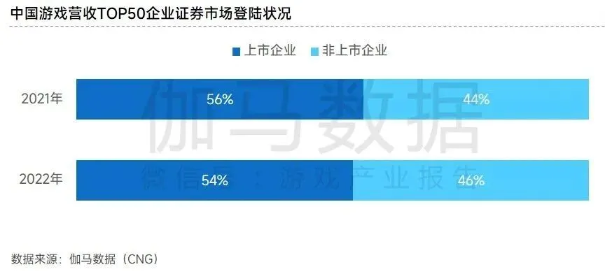 2023年上半年样本产品中,非上市游戏企业产品流水占样本游戏产品的整体流水比例为25.1%,相较2022年出现增长。中国游戏营收TOP50企业中,46%的企业为非上市企业,54%的企业为上市企业。这说明非上市游戏企业的竞争力提升,且部分较为优质的企业还在持续成长,并跻身到头部位置。