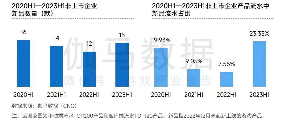 2023年上半年,新品流水大幅回升,同比增长134.1%,为近四年最高,超过了2021年的水平。非上市游戏企业共推出了15款新品,同比增加3款。在非上市游戏企业产品流水中,新品流水占比达到23.33%,为近4年新高。由于新品的质量普遍较高,流水占比明显上升。