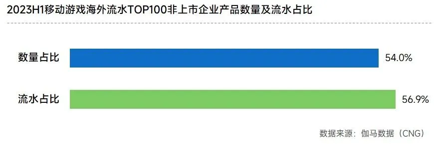 2023年上半年,移动游戏海外流水TOP100中非上市企业产品流水占比为56.9%,数量占比为54.0%。非上市游戏企业占比均高于上市游戏企业,说明非上市游戏企业在海外市场具备较强竞争力。