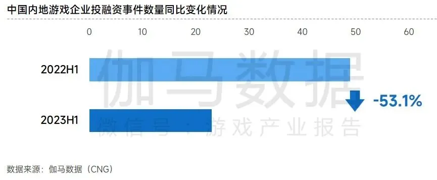 根据伽马数据统计,2023年上半年中国内地游戏企业投融资事件数量同比下降53.1%。在2022年大幅下滑后,2023年资本市场态度仍较为冷淡,产品还处于研发期的非上市游戏企业可能会面临较大的资金压力。