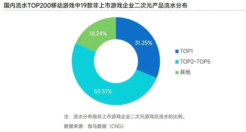 据伽马数据统计,2023年上半年国内流水TOP200移动游戏中共有19款非上市游戏企业研发的二次元产品,同比增加5款, 二次元产品流水集中于单款产品的现象有所改善,TOP1产品的流水占比从2022年上半年的59.21%下降至31.25%,TOP2~TOP5产品的流水占比由25.04%上升至50.51%。此外,2023年上半年有3款流水较高的二次元新品进入TOP5。