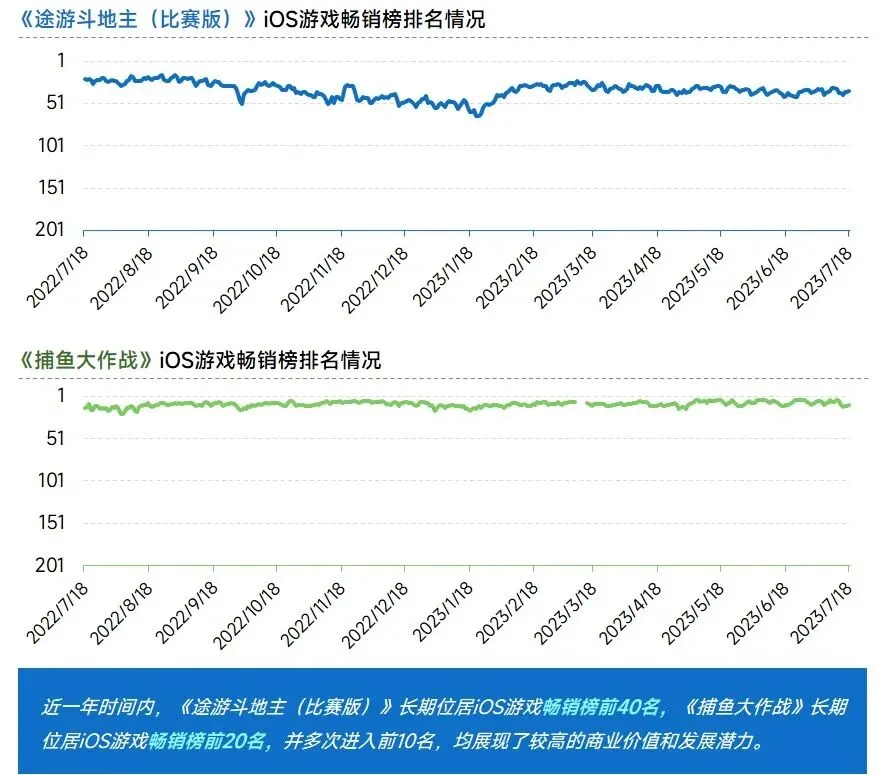 途游游戏是国内最早使用虚幻引擎4开发捕鱼游戏产品的企业。引擎技术让《途游休闲捕鱼》的动画、特效等视觉效果领先于竞品。同时,途游游戏还通过IP联动、元素融合的方式,为成熟产品持续更新活动玩法,使用户对游戏内容长期保持新鲜感。以《捕鱼大作战》与“圣斗士星矢” 的联动为例,途游游戏对联动IP的定位精准, “圣斗士星矢” 粉丝与捕鱼类游戏用户在年龄分布上有所重合,既可以通过“圣斗士星矢”IP吸引捕鱼类的潜在用户,也可以强化游戏内IP粉丝对于游戏的认同感;IP联动内容质量较高,不仅有特效华丽的联动角色,还推出了联动BOSS“巨蟹座”,提升了玩家的沉浸感。除IP联动外,途游游戏还在《捕鱼大作战》中推出了“山海异兽”“机甲纪元”“西游纪元”“机甲三国”等多个主题,通过元素融合丰富了游戏的表现形式。优质的内容更新让途游游戏自研产品的竞争力不断增强,《捕鱼大作战》上线后在iOS游戏畅销榜的排名持续上升,自2023年2月起保持在前10名附近,品类优势进一步扩大。