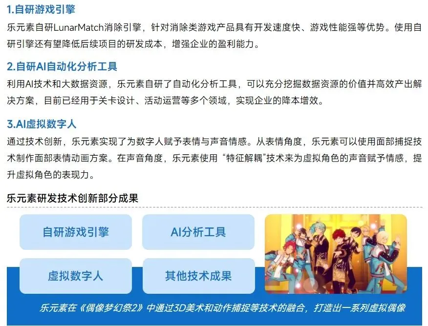 在非上市游戏企业竞争力模型中,乐元素在研发力方面得分较高,深层原因是其多年来坚持研发技术的创新。乐元素技术创新的部分成果主要体现在以下方面: