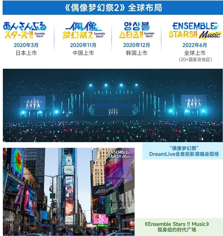 乐元素海外影响力的提升体现在其IP生态的塑造层面。乐元素依托“偶像梦幻祭”系列手游在海外地区积攒的高人气实现了游戏产品的IP化,持续推出了多种形式的优质IP文化内容,包括漫画、动画、CD专辑、舞台剧等,构建了完整的IP生态。2022年在日本上映的动画电影《偶像梦幻祭!!-Road to Show!!》票房超过3.5亿日元,这是乐元素原创IP在海外影响力的体现。