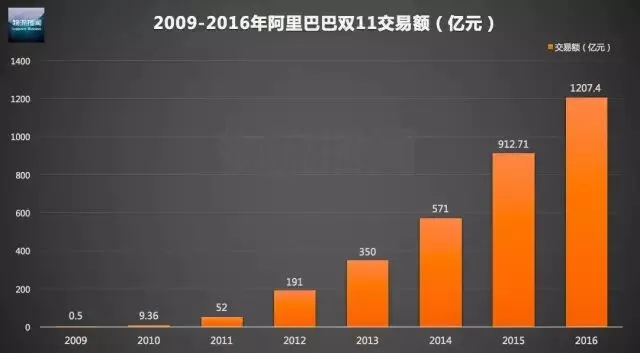 20秒过1亿、52秒上10亿、6分58秒破100亿。双11刚过半,12小时29分26秒,交易额已经达到824亿元,超过了2015年全国社会消费品日均零售额。2016天猫双11全天交易额最终成绩1207亿,当天累计物流订单量完成6.57亿件,创历史新高。
