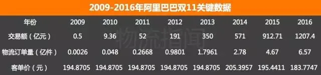 通过最后三年的交易额及产生的物流订单量,我们不难算出这三年的客单价,取这三年客单价的平均值我们可以粗略的估算出阿里巴巴双11八年来的物流订单量。