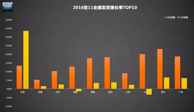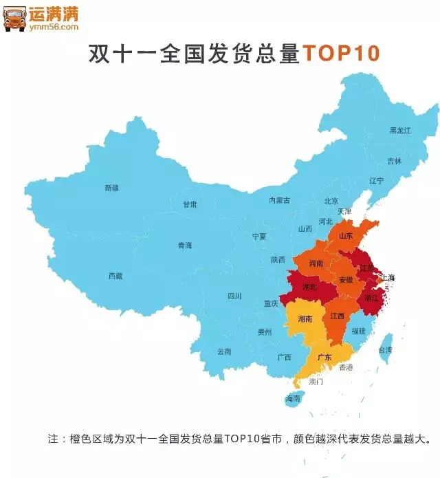 江浙沪、广东地区作为电商集中地区,本周物流发货量呈持续增长趋势。同时,两地亦是经济发达和消费热点区域,两地进货量本周同样呈持续增长趋势。2016年双11全国发货总量TOP10的城市分别为:江苏、浙江、湖北、山东、河南、安徽、江西、上海、湖南、广东。