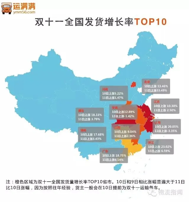 运满满的大数据显示,平台全国发货量本周呈递增趋势,11月10日比9日增加10.93%, 11日比10日增加1.45%。全国发货增长率前10名的城市分别为:北京、河南、江苏、安徽、湖南、湖北、江西、上海、浙江、广东。