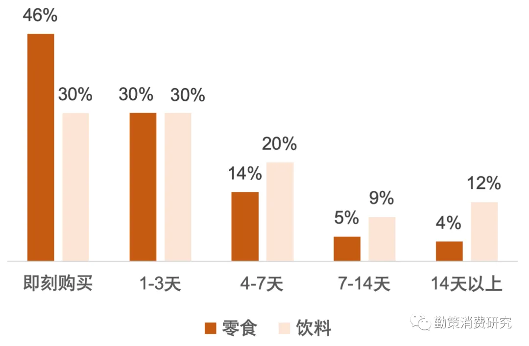 据小红书调研数据,零食购买决策周期整体短于饮料,其中近5成消费者在产生购买想法后会即刻购买,近8成消费者会在3天内进行购买。
