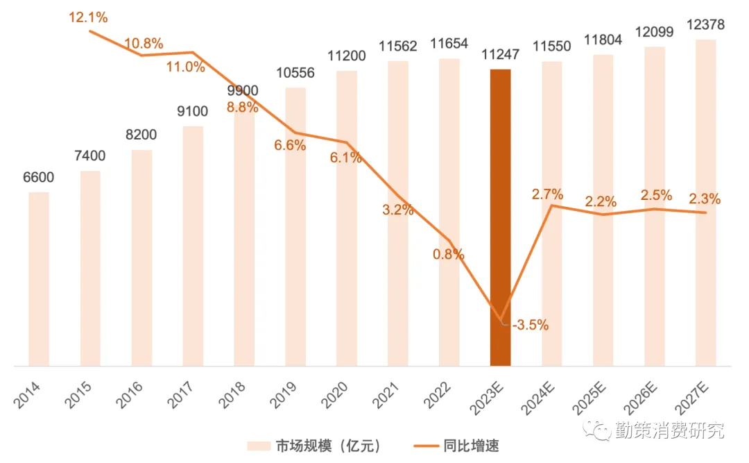 近年来,我国零食行业市场规模增速持续放缓,2023年受整体市场环境影响,零食行业消费复苏未及预期,预计行业规模为11247亿元,同比下滑3.5%。