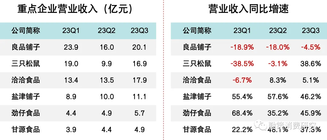 盐津铺子、劲仔食品、甘源食品做为渠道多元化变革下的代表企业,今年以来收入增长显著,各单季度增幅基本保持40%-50%。