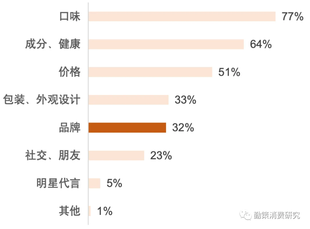 消费者购买零食考虑因素Top3分别是口味、成分、价格,占比为77%/64%/51%,品牌占比为32%,相对较小。