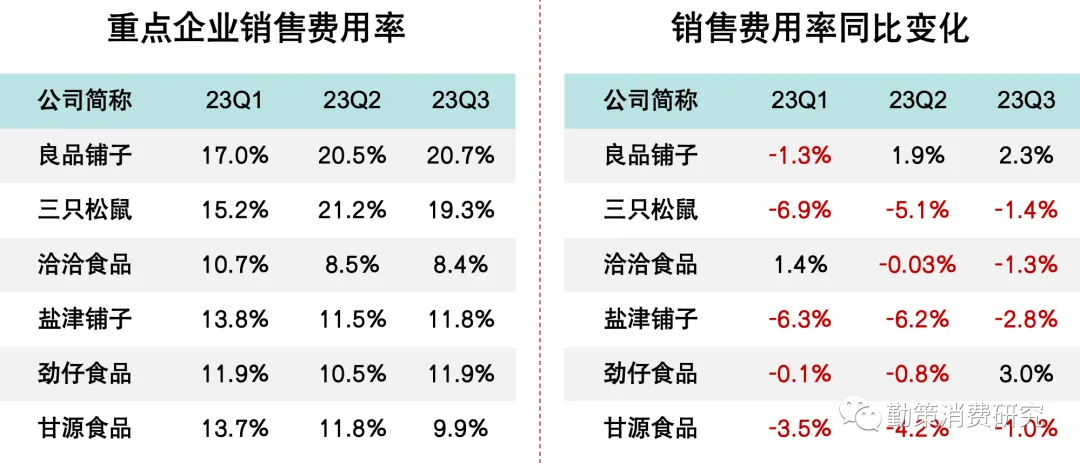 销售费用率方面,在零食店、电商平台等渠道带动规模效应提升,摊薄固定成本下,甘源食品、盐津铺子调整渠道策略、减少商超渠道投入。