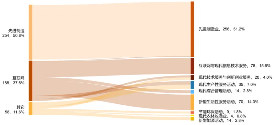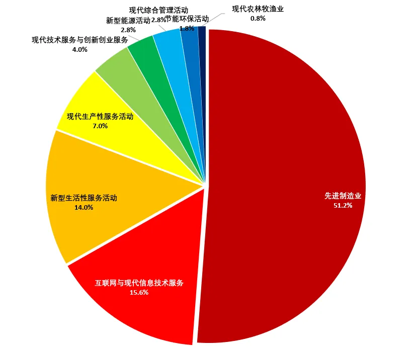 从行业分类上看,先进制造业企业占比最高,达51.2%,其次是互联网与现代信息技术服务业、新型生活服务活动企业,占比分别为15.6%和14.0%。其他行业领域分布中,现代生产服务活动占比为7.0%,现代技术服务与创新创业服务业占比为4.0%,新型能源活动与现代综合管理活动占比均为2.8%左右,节能环保活动与现代农林牧渔业占比较低,分别为1.8%与0.8%。