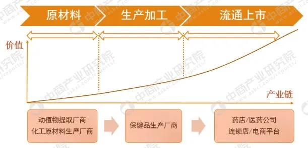 保健品行业产业链上游是各种原材料生产商,主要包括动植物提取厂商、化工原材料生产厂商及部分制药厂等。下游是流通领域的各种渠道,主要包括药店、医药公司、连锁店和电商平台等。作为中游的保健品生产企业主要负责生产加工和包装等。