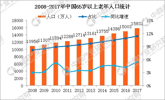 目前,中国已经成为世界上老年人口最多的国家,据国家统计局最新数据,2017年60周岁及以上人口24090万人,占总人口的17.3%,其中65周岁及以上人口15831万人,占总人口的11.4%。当一个国家或地区60岁以上老年人口占人口总数的10%,或65岁以上老年人口占人口总数的7%,即意味着这个国家或地区的人口处于老龄化社会。中国老年人口比例严重超标。