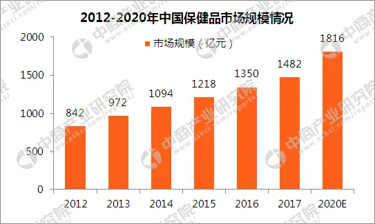 受消费者治疗向预防诉求转变、健康意识提升、健康需求精细化、追求高品质保健品等因素推动,2014年中国保健品市场规模突破千亿,2017年中国保健品市场规模逼近1500亿。中商产业研究院研究院预计2020年中国保健品市场规模将达1816亿元。