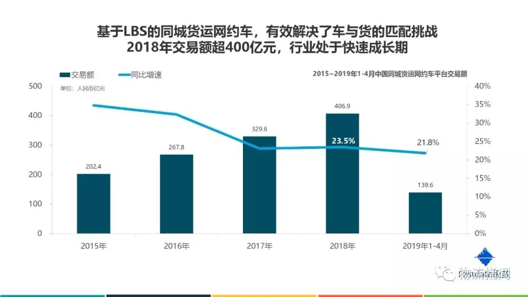 2018年,基于LBS的同城货运网约车交易额超400亿元,行业处于快速成长期。