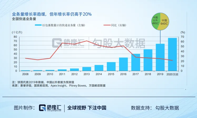 在电商件、民营资本乃至近些年商务件崛起的刺激下,中国快递市场的商业版图不断得到扩大,全国的快递业务量从2009年的19亿猛增到2019年的640亿,年复合增速达42%。若按业务量计算,中国自2014年以来一直是全球最大的快递市场,包裹数量甚至超过全球一半的份额。
