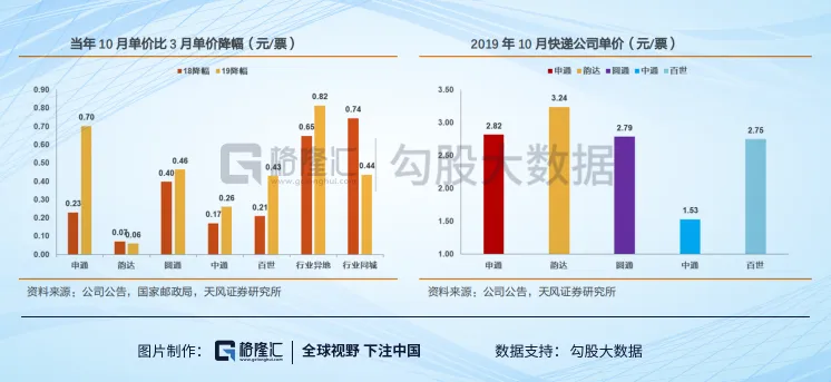 具体而言,假设以当年Q3的快递单价对比Q1的快递单价,2019年申通、韵达、圆通、中通、百世的单价降幅分别为0.70元/票、0.46元/票、0.26元/票及0.43元/票,除了韵达的单价降幅基本持平外,另外四家寡头的单价降幅都在明显提高。