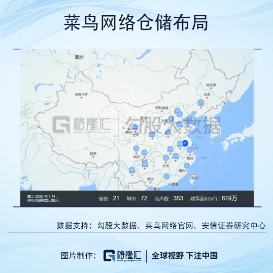 公开资料显示,截至2019年底,顺丰快运拥有51个快运中转场,约1,300个快运网点,快运场地面积超过175万㎡,1.9万余台快运收派车辆,1134条快运干线,8,170条支线,业务覆盖全国31个省、362个主要城市及地区。同时,通过“自建+合作”的物流设施建设方式,目前菜鸟的仓储资源覆盖全国21个省份,72个城市,总面积达到619万㎡,超越国内大部分的快递企业,为加盟模式的“四通一达”提供了强大的仓储系统优势。