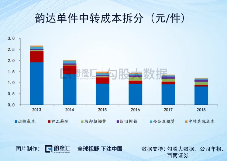 一般来说,加盟模式的快递公司的快递业务成本可以分成面单、运输和中心操作成本,其中后两项又统称为中转成本,能够占到总成本中80-90%的份额。以韵达为例,西南证券将中转成本划分为运输成本、职工薪酬、装卸扫描费、折旧摊销、办公室租赁和其他。从下图我们可以看出,2013年以来,韵达的运输成本、人工成本和办公租赁成本都在随着件量的增长而逐渐减少,主要得益于件量增长对固定成本部分的分摊,以及车队管理、路由管理、自动化分拣设备等技术升级对可变成本部分的降低。