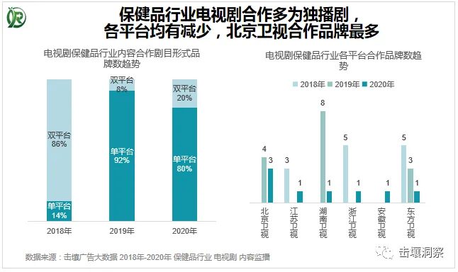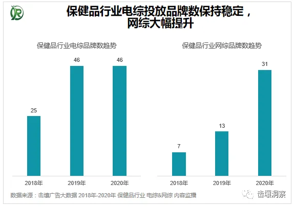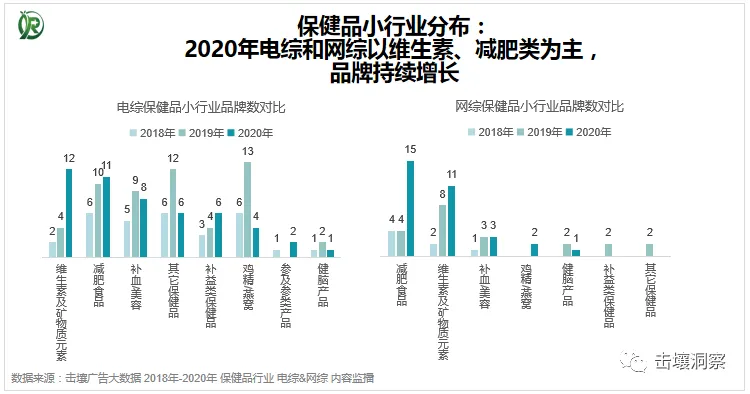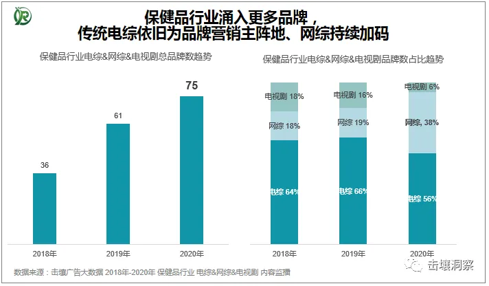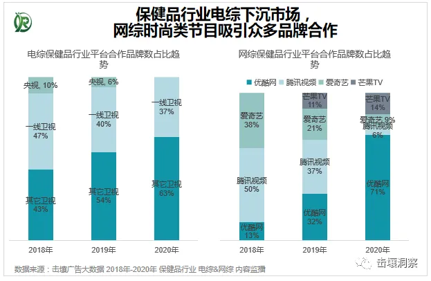 2020年保健品行业整体品牌数不断增长,内容合作市场涌入更多品牌。品牌内容植入依旧以电综为主,但占比有所收紧,网综占比呈倍数增长、电视剧持续下滑。