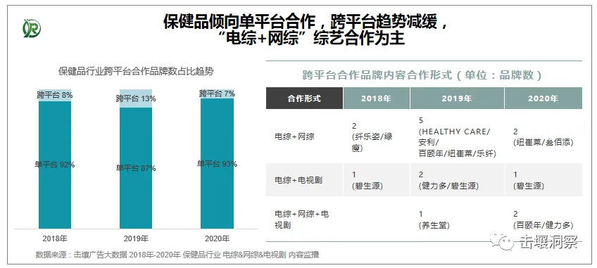 2018年至2020年保健品行业内容合作以单平台为主,2020年跨平台合作品牌占比缩减,“电综+网综”合作品牌最多。