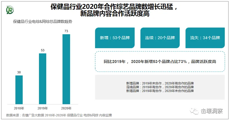 2018年至2020年综艺合作品牌数加速增长,2020年同比2019年,新增53个品牌占2020年品牌总数的73%,连续合作20个品牌,流失合作34个品牌,整体保健品行业活跃度较高。