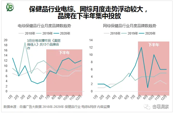保健品行业电综和网综月度品牌数均在下半年集中投放,分别在10月、8月迎来峰值。
