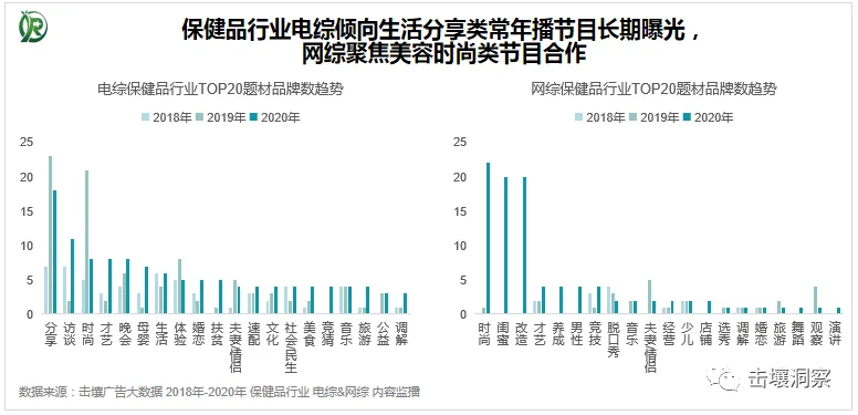 2020年保健品行业依旧以电综为内容合作主阵地,2020年保持稳定合作,网综合作品牌数大幅增长涌入新品牌,主要来自于优酷平台《闺蜜好美》时尚类节目。