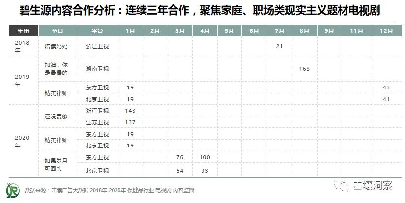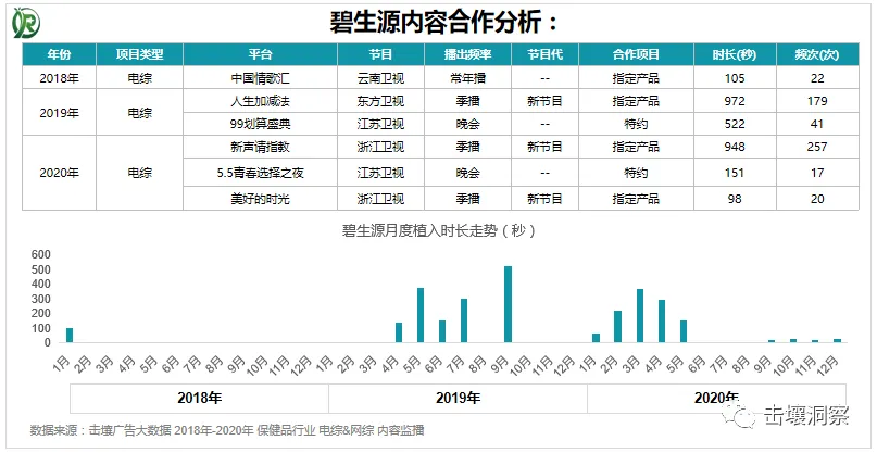 碧生源2018-2020年持续投放,小权益合作一线卫视季播节目,大权益合作江苏卫视晚会,2020年加大投放量聚焦主流平台。