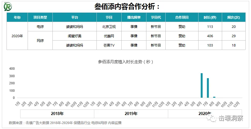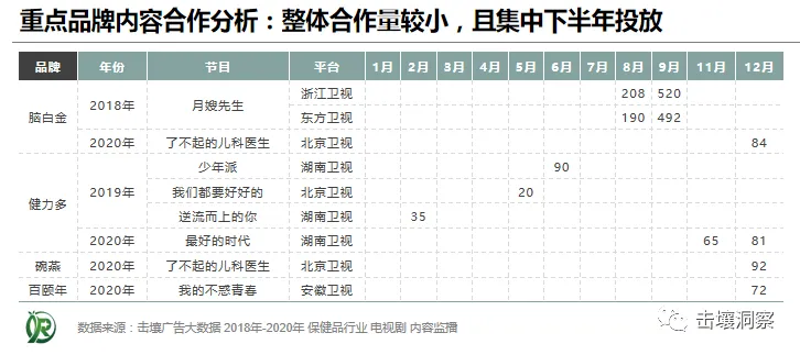 内容合作大户古方、香丹清、燕之屋、康美等品牌2020年不再投放,纽崔莱保持稳定合作、碧生源品牌加大投放、与新品牌汤臣倍健和叁佰添并列第一,其它多为新品牌合作2档节目,表现较为活跃。