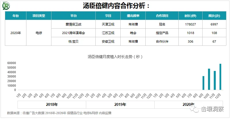 汤臣倍健2020年初次试水内容领域,聚焦电综投放,以常年播节目合作为主长期曝光、同时配合晚会焦点曝光。