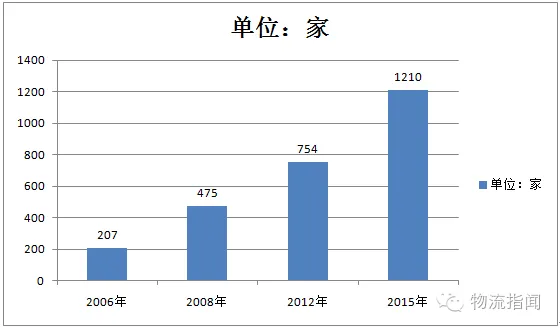 经核实,截至本次调查结束,全国包括运营、在建和规划的各类物流园区共计1210家,比2006年的207家增长484%;与2008年的475家相比,增长155%;与2012年的754家相比,增长60%。如下图所示: