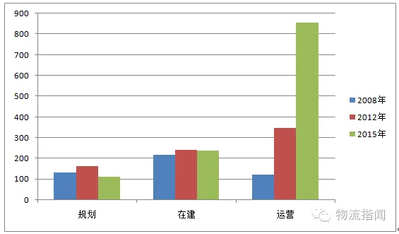 与前两次全国物流园区调查数据相比,本次处于运营状态的物流园区数量大幅上升,由2012年的348家上升至2015年的857家。处于在建状态的物流园区的数量与2012年基本持平。如下图所示: