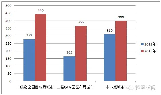 根据《全国物流园区发展规划(2013—2020年)》,我们对所确定的物流园区布局节点城市进行分析。本次调查显示,近三年来国家规划的节点城市物流园区数量增长较快,其中一级物流园区节点城市的园区数量由2012年的279家增长到2015年的445家;二级物流园区节点城市的园区数量从2012年的165家增长到2015年的366家。