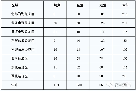 从各经济区域的实际状态看,北部沿海经济区的物流园区数量在八大经济区中居于首位,黄河中游经济区的物流园区数量在近三年中迅速增加,排名第三,而长江中游经济区与黄河中游经济区在规划、在建园区数量分别位居前两位。如下表所示。我们认为,丝绸之路经济带和长江经济带国家战略的提出对两个经济区域的物流园区规划和建设起到了促进作用。