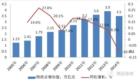 2014年,我国物流业增加值3.5万亿元,可比增长9.5%,保持较快增长,其中,交通运输业增加值2.4万亿元,可比增长8.3%,贸易物流业增加值6781亿元,可比增长7.9%,仓储业和邮政物流业增加值分别增长4.8%和35.6%。